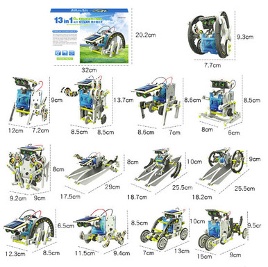 Introduce your child to the wonders of engineering and renewable energy with our 13-in-1 Solar Robot Kit. With a step-by-step user's manual, kids can build 13 different types of robots by splitting and reassembling, providing hours of educational fun. These robots can move on land or water, thanks to their versatile design and included moving and connecting parts like gears, plates, tires, and shafts. Plus, the parts are easily disassembled after completing each robot build, allowing for endless creativity and experimentation.